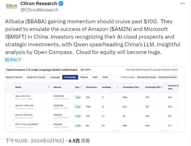 香橼称,阿里巴巴正获得动能,股价有望涨穿 100 美元,在中国将效仿微软和亚马逊成功,投资者将认识到阿里的人工智能(AI)云前景和战略投资。香橼还指出,在中国的大语言模型(LLM)领域,阿里的模型通义千问是佼佼者。