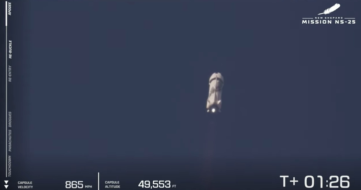 贝索斯旗下的太空公司蓝色起源的火箭搭载宇航员升空,成功完成了 NS-25 任务,为近两年来首次恢复载人飞行。火箭和乘员舱已经安全返回地球。