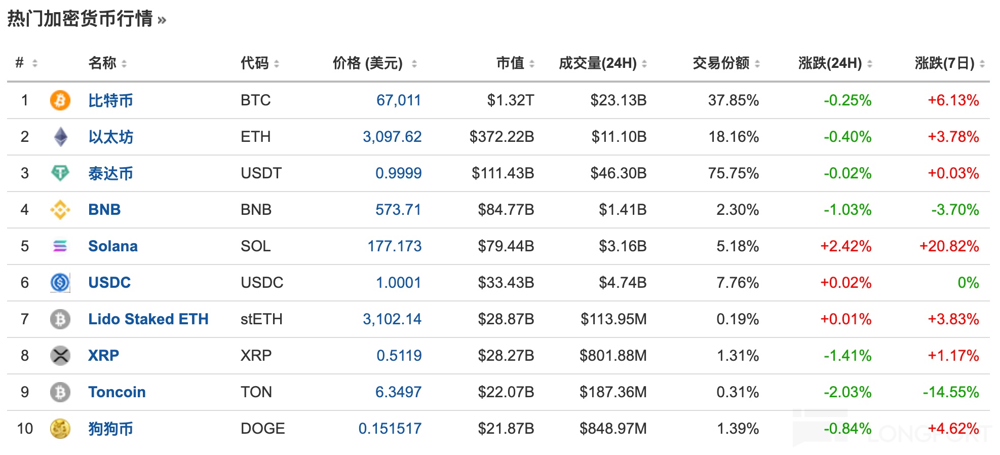 比特币现报 67011 美元,24 小时之内微跌;以太坊现报 3097 美元,24 小时跌 0.4%。