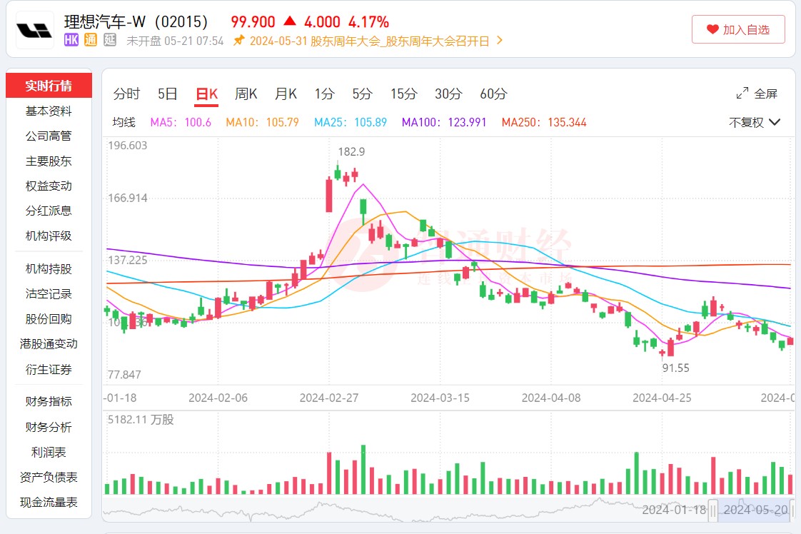 值得注意的是,二级市场上,近期理想汽车遭遇了多重利空的袭击。一季报发布后,美股理想汽车下挫,收跌 12.78%。港股方面,理想股价自 2 月份创下的高位以来已经累跌逾 40%。