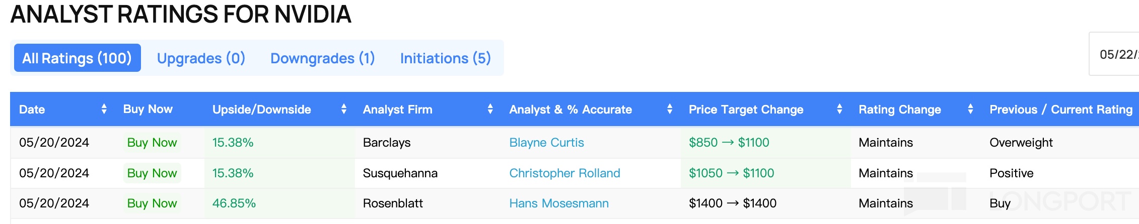 根据 benzinga 数据,4 月份以来,各大行对英伟达的目标价基本都在 1000 美元以上,最高为