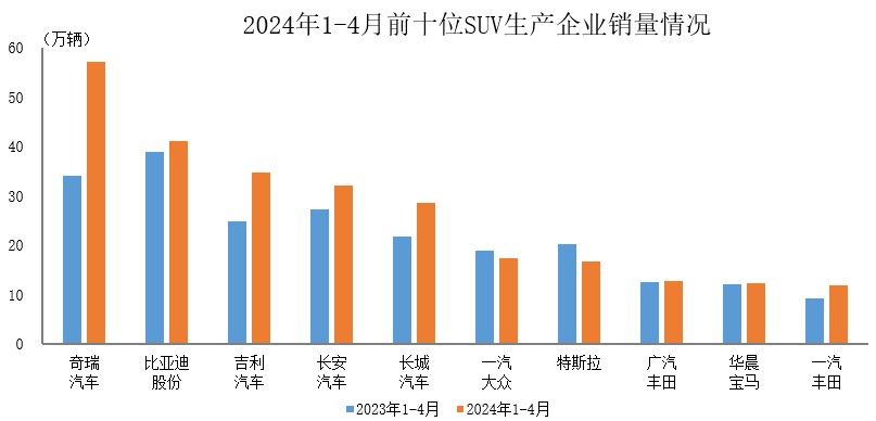 据中国汽车工业协会统计分析,2024 年 1-4 月,销量排名前十位的 SUV 生产企业共销售 264.9 万辆,占 SUV 销售总量的 65.3%。在上述十家企业中,与上年同期相比,一汽大众和特斯拉销量下降,其他企业销量均呈不同程度增长。
