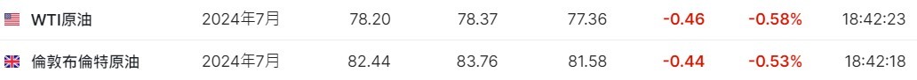 3. 截至发稿,WTI 原油跌 0.58%,报 78.20 美元/桶。布伦特原油跌 0.53%,报 82.44 美元/桶。