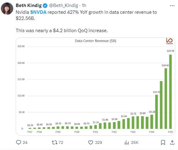 英伟达当季毛利润率为 78.9%,显著高于预期,分析师原本认为将从上季度的 76.7% 小幅扩大至 77%。EPS 也高于预期的每股收益 5.65 美元,是上年同期 1.09 美元的五倍多。