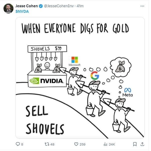 还有人称,英伟达就好比在淘金时代向一众科技巨头(唯一)出售挖黄金的铲子。