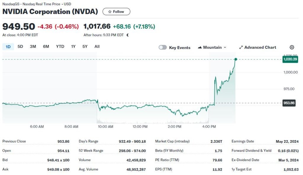 周三英伟达收跌 0.5%,周二曾以 953.86 美元创下历史收盘新高,今年以来累涨近 92%,显著跑赢标普 500 指数和纳指的涨超 11%。