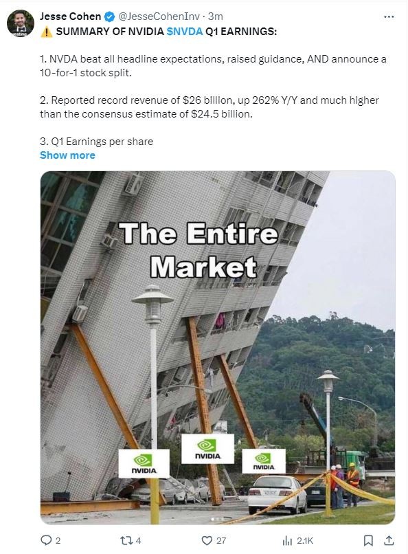 英伟达 Q1 收入猛增 260%、利润涨六倍,宣布 10 比 1 拆股,盘后涨 7% 至新高 | 财报见闻