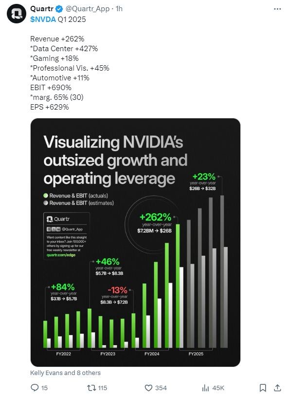 5 月 22 日周三美股盘后,自去年起在 AI 热潮中风头无两的芯片巨头英伟达发布了截至今年 4 月底的 2025 财年第一财季业绩。