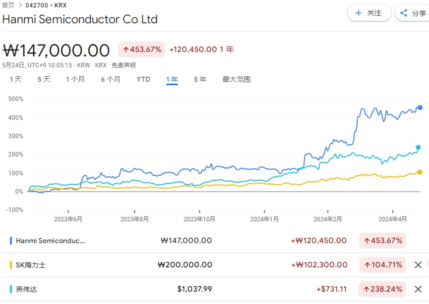 涨势到底有多可怖?直观点来看,Hanmi 半导体近一年的涨幅已经远远跑赢了英伟达和 SK 海力士。