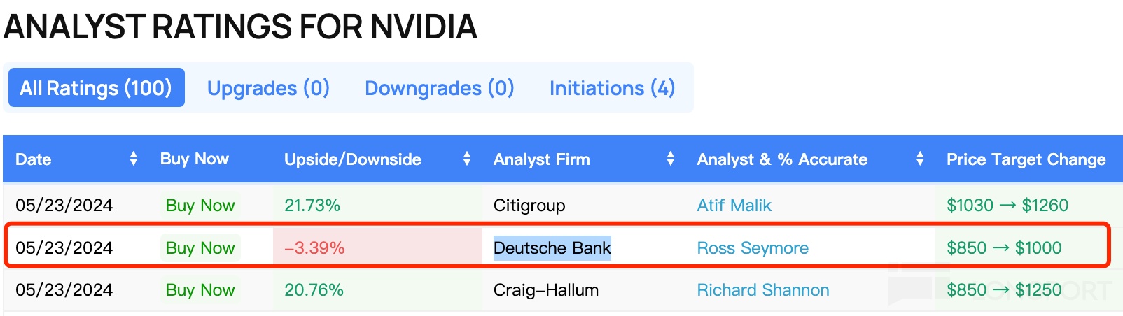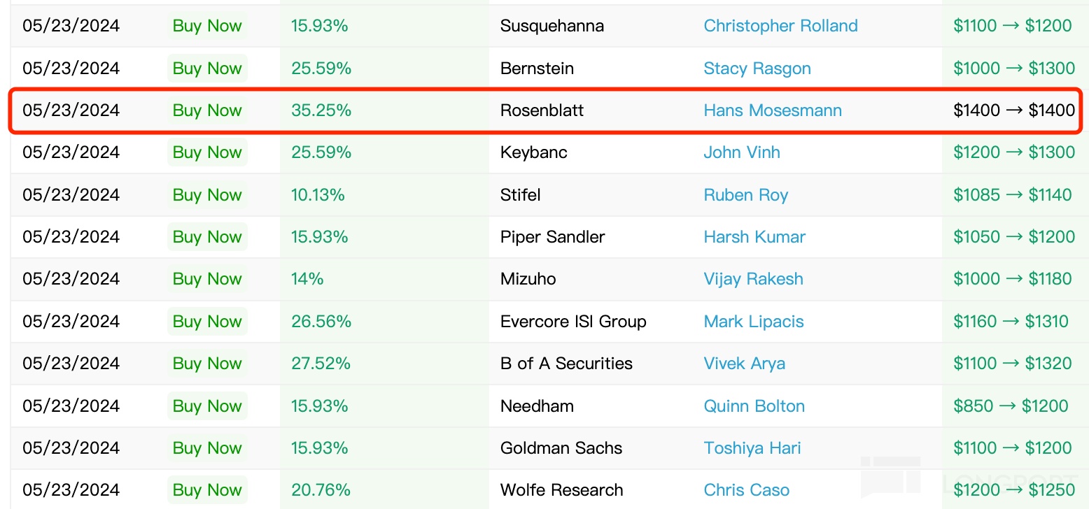 根据 Benzinga 统计数据,有 29 家投行对英伟达进行最新的评级,仅有一家的目标价低于市价(Deutsche Bank,从 850 上调到 1000 美元),有 2 家的目标价和上一次相同(Oppenheimer,和 Rosenblatt),最高目标价依然是 1400 美元(Rosenblatt 和 Cantor Fitzgerald):