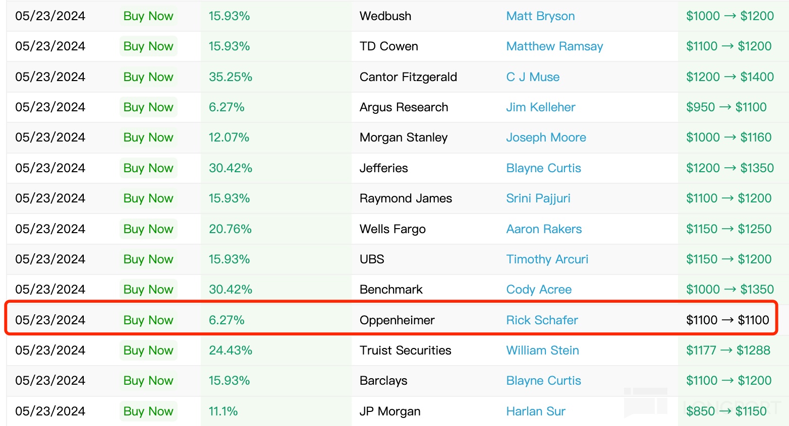 最高目标价依然是 1400 美元,来自投行 Rosenblatt 和 Cantor Fitzgerald。