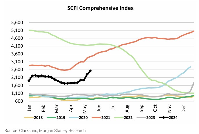 大摩在 24 日的一份报告中指出,受红海危机干扰航运市场运力,导致欧洲航线的运力短缺,叠加新交付的船舶不能完全弥补运力短缺,航运价格在飙升。
