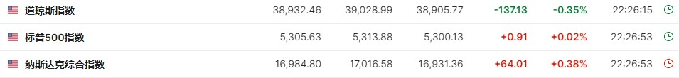 上周创去年银行业危机以来最大周跌幅的道指周二早盘曾跌近 180 点、跌近 0.5%;上周创历史新高的纳指早盘继续保持涨势,盘中触及历史新高时日内涨近 0.6%;已累涨五周的标普 500 指数盘初曾涨逾 0.2%,盘中几度转跌,曾转跌至跌约 0.09%,后小幅转涨。