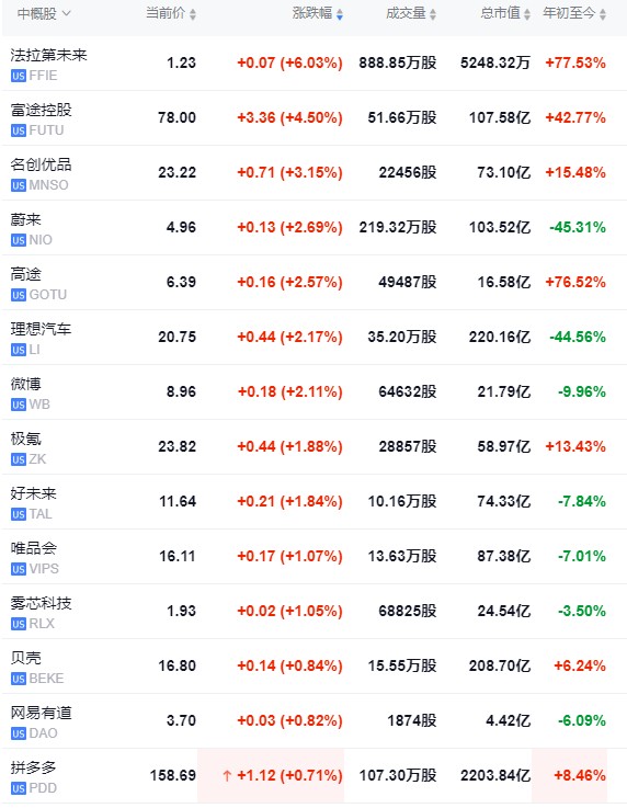 中概股普涨,法拉第未来涨逾 6%,蔚来、理想涨逾 2%,品多对涨 0.7%。
