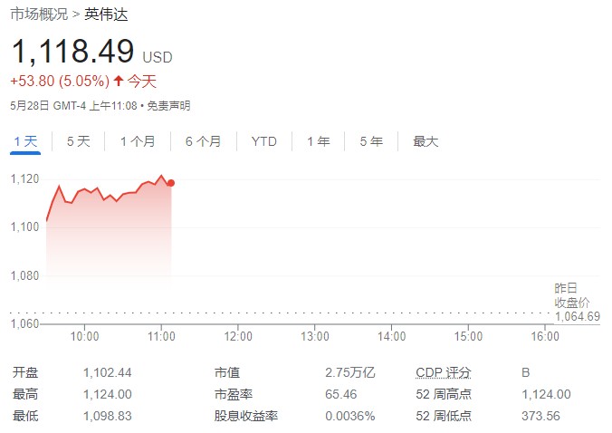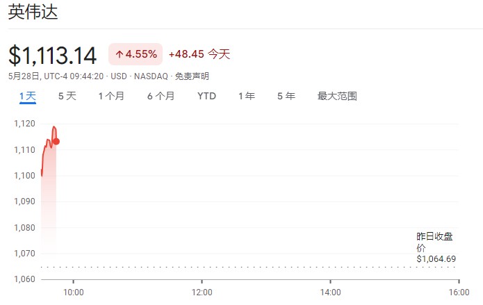 英伟达一度涨逾 5%,英伟达上周宣布将进行 10:1 的加权股票拆分,业界猜测此举可能是为加入道琼斯工业指数做准备。