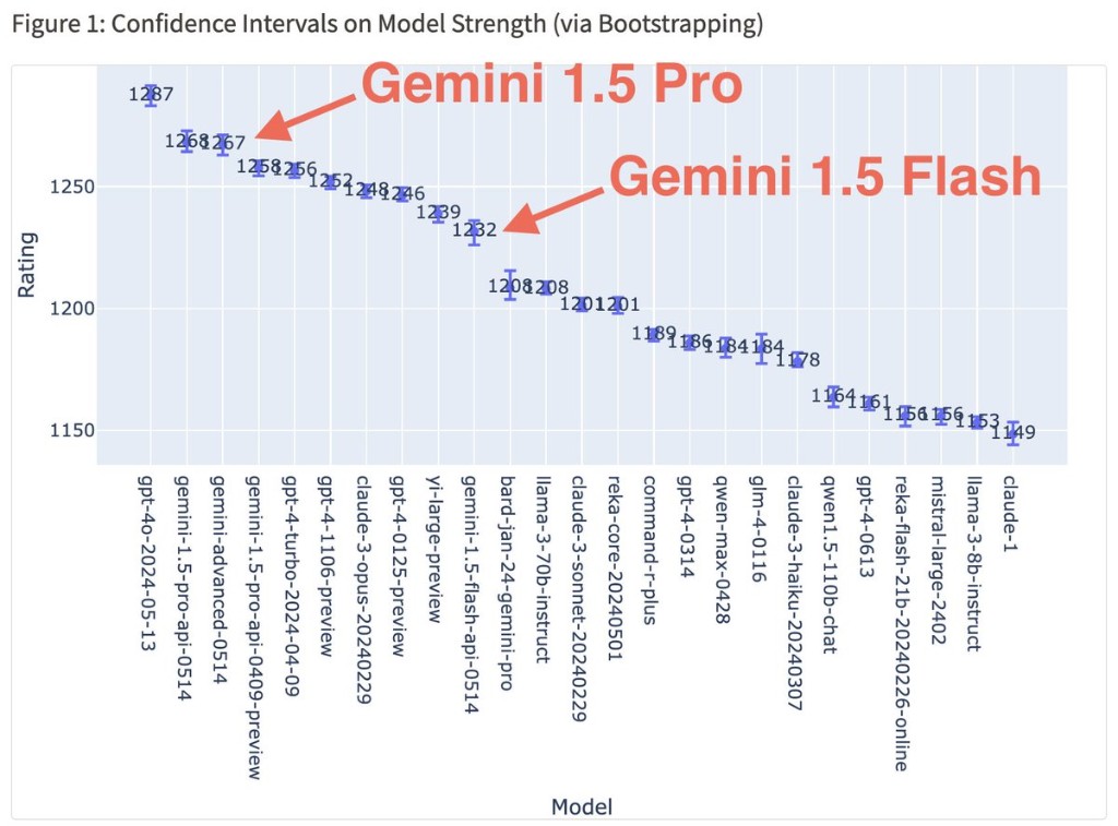 从大模型置信区间(Confidence Intervals)来看,Gemini 的测试结果也名列前茅。