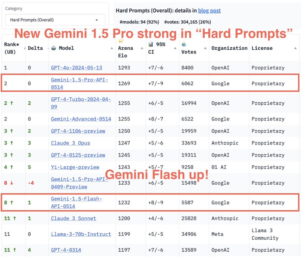 此外,在 Hard Prompts 测试中,Gemini 同样名列前茅。在 Hard Prompts 测试中,大模型需要面对那些更具挑战性的问题,Gemini 1.5 Pro 在这一测试中排名第二,仅次于 GPT-4o.