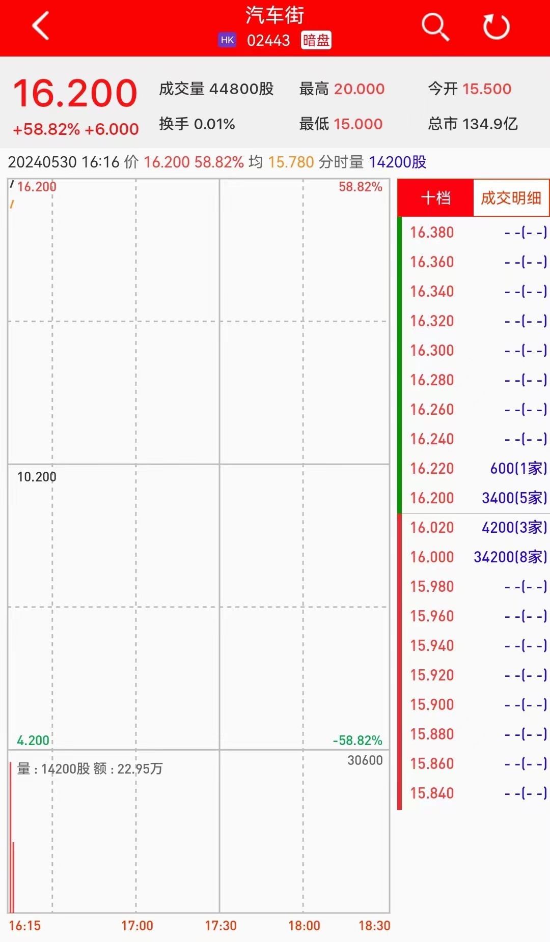 汽车街 (02443) 将于 5 月 31 日 (周五) 在香港挂牌。截至发稿,暗盘交易显示报价 16.2 港元,较招股价 10.2 港元上涨 58.82%。每手 200 股,不计手续费,每手赚 1200 港元。