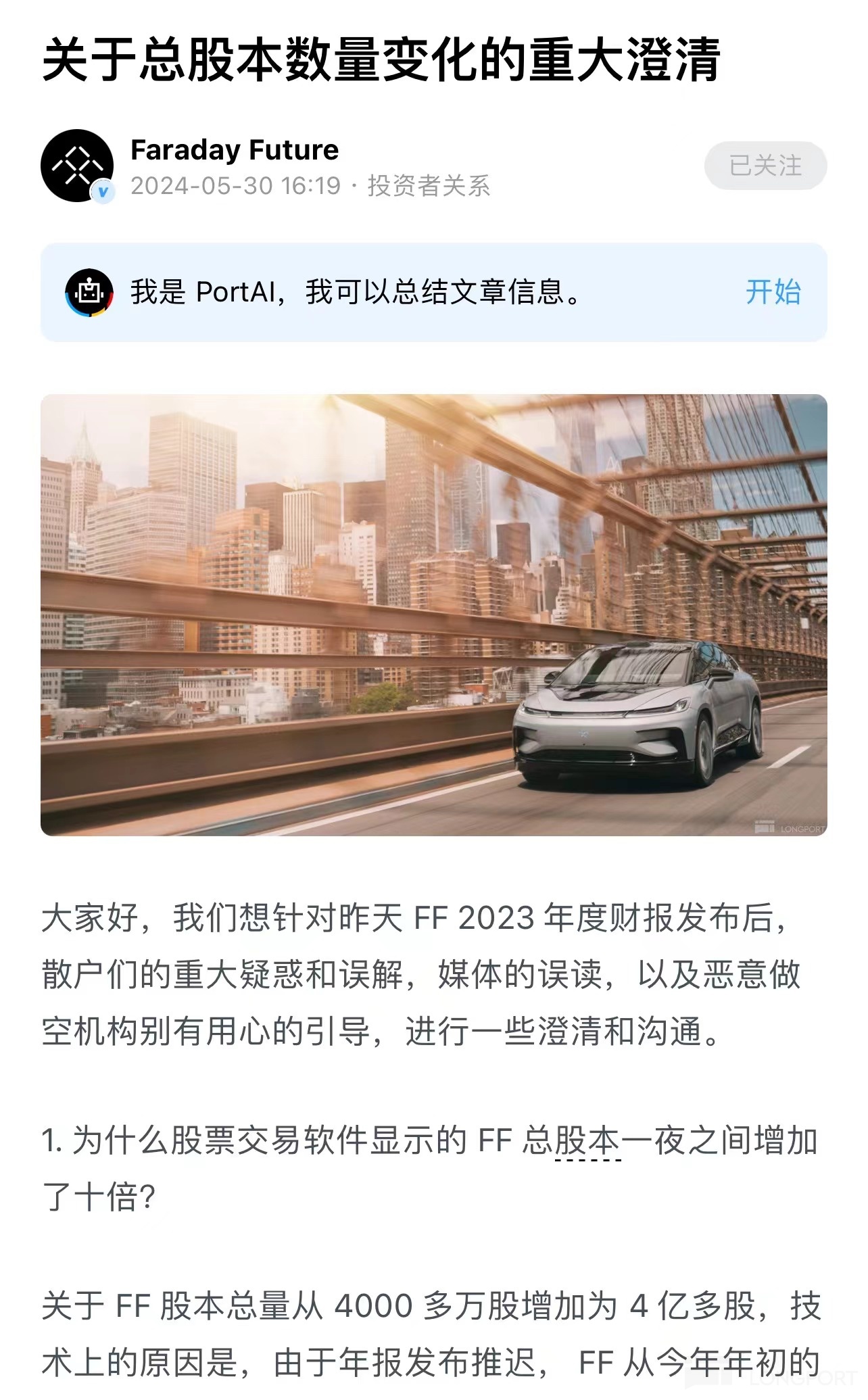 Faraday Future 的官方社区账号 5 月 30 日下午发布了《关于总股本数量变化的重大澄清》的声明,称 FF 总股本 “一夜之间增加十倍” 是由于年报推迟发布的技术原因,因此券商平台无法更新最新数据。
