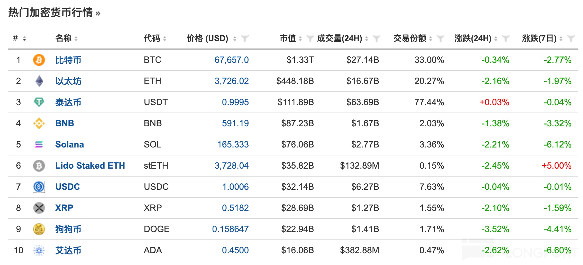 比特币现报 67657 美元,24 小时微跌;以太坊现报 3726 美元,24 小时跌超 2%。