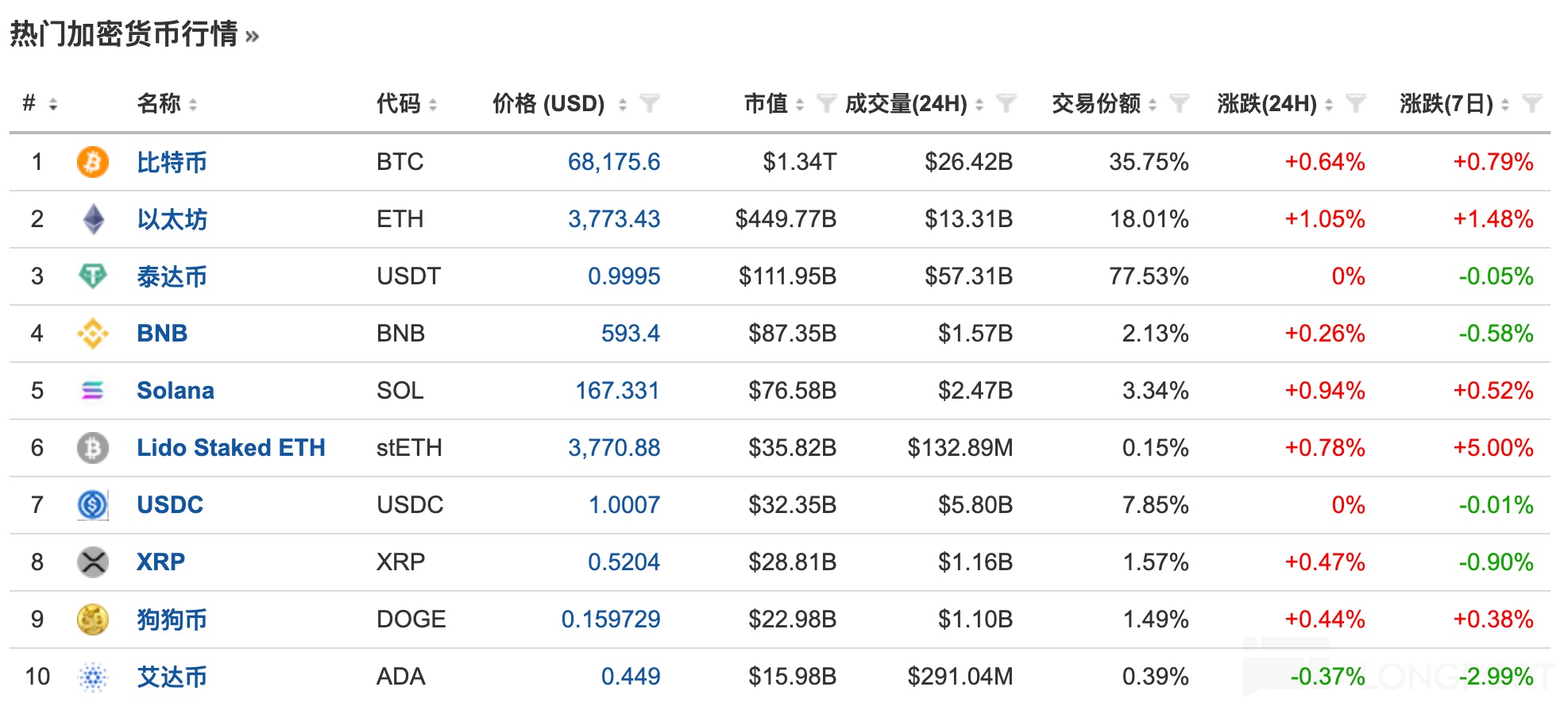 比特币现报 68175 美元,24 小时涨近 1%;以太坊现报 3773 美元,24 小时涨超 1%。