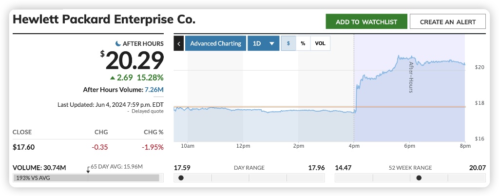 强劲的 AI 服务器业务催化下,慧与科技(Hewlett Packard Enterprise)上季度收入与业绩指引超预期,公司股价盘后大涨 15%。