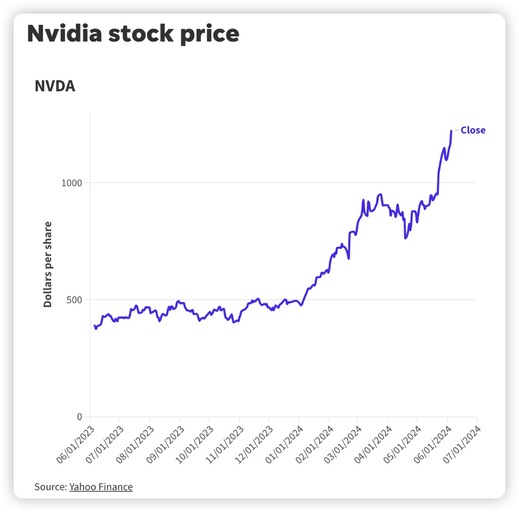 最近几个交易日连续大涨后,隔夜市值已经超越苹果,跻身全美第二大公司,股价超过 1200 美元。拆股后,英伟达的股价将变成 120 美元左右,更加亲民,可以吸引更多散户投资者参与。