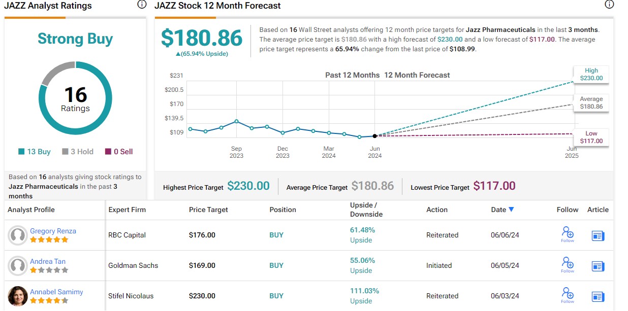 华尔街分析师们对于爵士制药的 “强烈买入” 一致评级是基于 16 篇评论,其中包括 13 篇 “买入” 评级研报,3 篇 “持有”,该股 180.86 美元的平均目标价甚至比高盛的观点更为乐观,这表明该股在周一收盘价 108.99 美元的基础上还有 66% 的潜在上涨空间。