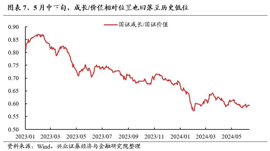 一方面,5 月中下旬科技成长的拥挤度、股价均处于低位。从拥挤度来看,截至 5 月 24 日,半导体、消费电子、光模块、计算机设备、军工电子和办公软件等多数细分成长行业的拥挤度处于较低水平;从股价位置来看,截至 5 月 24 日,成长风格年初至今表现靠后,计算机、电子、传媒、军工等跌幅靠前;从成长/价值比价来看,5 月下旬时成长/价值相对位置也回落至历史低位。