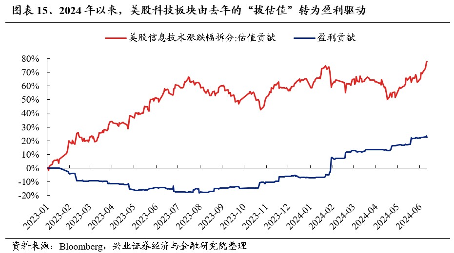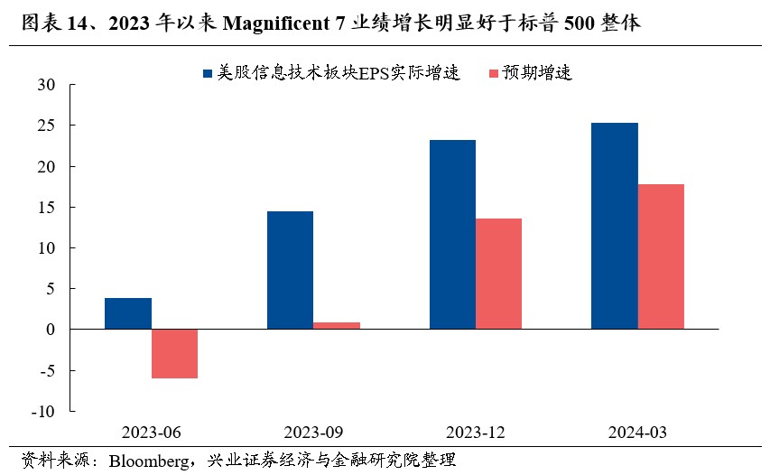 而美股 AI 板块超额收益的背后,则是其持续兑现的高景气预期。尽管拆分纳指涨跌幅的驱动力来看,2023 年主要由估值驱动,但其估值的提升也离不开基本面的支撑。受益于 AI 产业浪潮,市场预期美股科技板块业绩将实现快速增长,22 年底以来信息技术和通信的盈利预期持续快速增长,也催化初期的 “拔估值” 行情。但随着行情持续演绎,美股 AI 板块估值能够持续且稳定上涨则主要得益于其能够持续兑现市场的业绩预期,例如信息技术行业 2024Q1 EPS 增速录得 25.35%,再度好于市场预期。并且,值得注意的是,2024 年以来,美股科技板块的涨幅由去年的 “拔估值” 转为盈利驱动,进一步强化了基本面的重要性。
