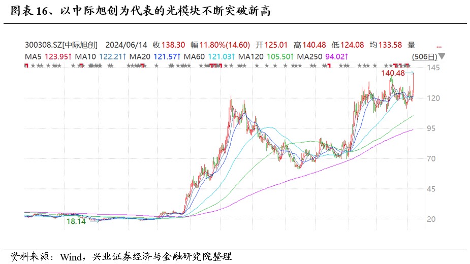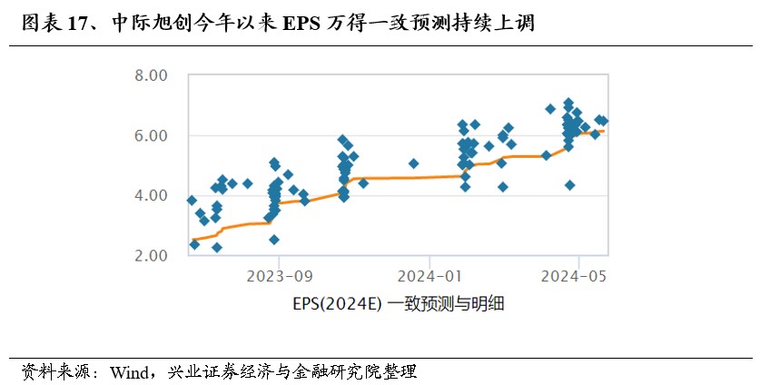 A 股亦是如此,以中际旭创为代表的光模块不断突破新高,也源自背后持续兑现的高景气。中际旭创 23 年、24Q1 净利润增速分别是 77.6%、303.8%,24 年一致预期增速 126.6%,高景气持续兑现,且去年以来预期 EPS 持续上修。