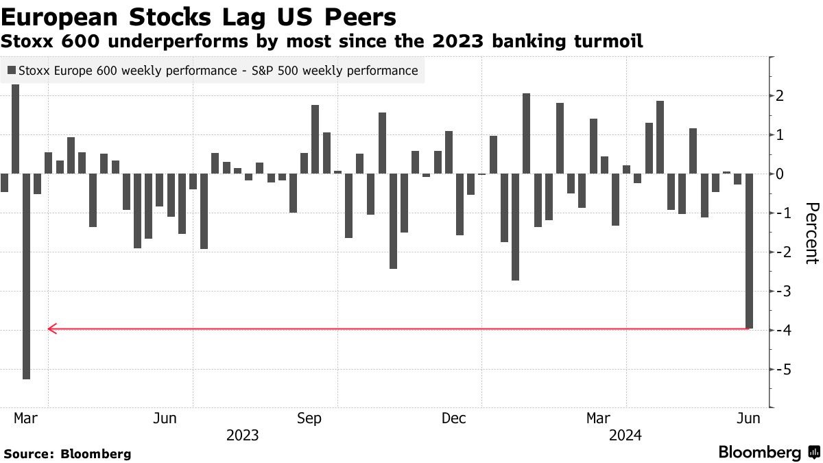 智通财经 APP 获悉,法国以及德国政治局势动荡带来的风险促使以花旗集团为代表的华尔街投资机构下调欧洲股票市场的评级,华尔街今年以来持续看涨的以强大基本面蓝筹股为主的低估值欧洲股市,却在近日沦落至华尔街 “弃子”。此外,华尔街策略师们近期更倾向于以大型科技巨头为导向的美国股票市场,表示一些试图进入欧股的资金可能转向美股。高盛、Evercore ISI 等华尔街机构近日纷纷上调美股基准指数——标普 500 指数目标点位,今年标普 500 指数甚至有望冲击 6000 点 (上周收于 5431.6 点)。