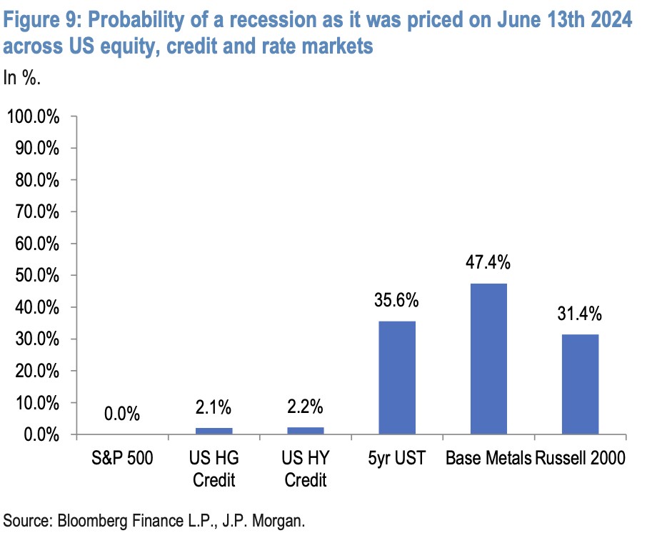 Marko Kolanovic 表示,目前所有风险资产的价格都反映了对经济衰退的 “非常小” 预期。截至 6 月 13 日,罗素 2000 小盘股指数暗示经济衰退的可能性为 31.4%。虽然小盘股的估值暗示经济衰退的可能性 “相当有限”,但标普 500 指数的估值暗示经济衰退的可能性为 0%。