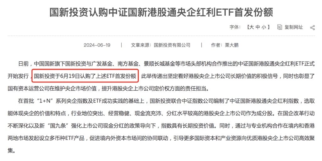 国家队出手购买 ETF,也助涨了市场情绪。周三国新投资在官网宣布,今天认购了广发、南方、景顺长城等基金公司旗下在发的首批中证国新港股通央企红利 ETF。这是在去年 12 月 1 日,国新投资在增持中证国新央企科技类指数基金后,再度出手央企系列 ETF 产品。