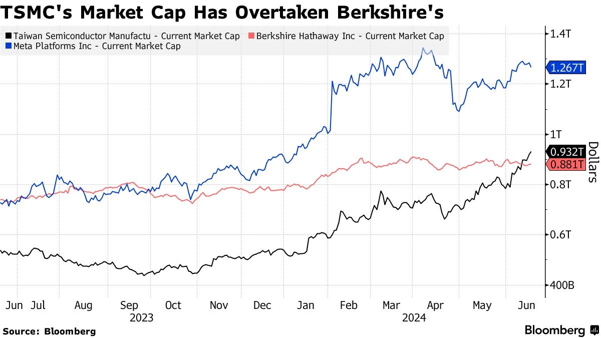 以台积电在美国上市的美国存托凭证 (即美股 ADR 价格) 来计算,台积电总市值上周超过 “股神” 巴菲特旗下的伯克希尔哈撒韦公司 (Berkshire Hathaway Inc.),成为全球市值排名第八的上市公司。今年以来,台积电美股 ADR 价格涨幅高达惊人的 73%,使其以 ADR 交易价格测算的总市值达到 9,320 亿美元,距离 1 万亿美元市值门槛越来越近。