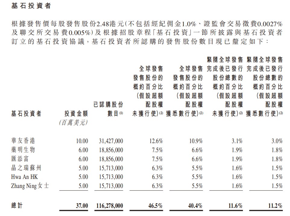 基石投资者是华友钴业、药明生物、汇添富、半导体的晶之瑞,以及两位个人投资者,这几位共持有 IPO 发行后总股本的 11.2%(假设算上公司股权激励授予增发),共 1.16 亿股。