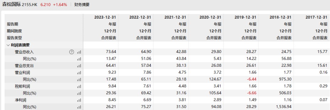 从收入来看,2023 年森松国际营收 73.6 亿元,较 22 年增长 13.5%。归母净利润为 8.45 亿元,同比增长 26%,营收利润实现双位数增长。过去 3 年,森松国际也是保持着高增长。