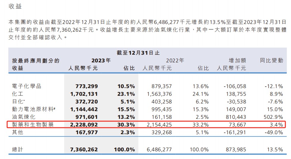 其中,生物制药收入为 22.28 亿元,同比增长 3.4%。在生物医药融资逆风的加息周期里,这已是不错的表现。而占比第二的化工行业,收入同比增 8.9%,收入占比第三的动力电池原材料行业,收入同比增长 15%。这两个行业使得森松国际在市场的低预期里实现了高增长。