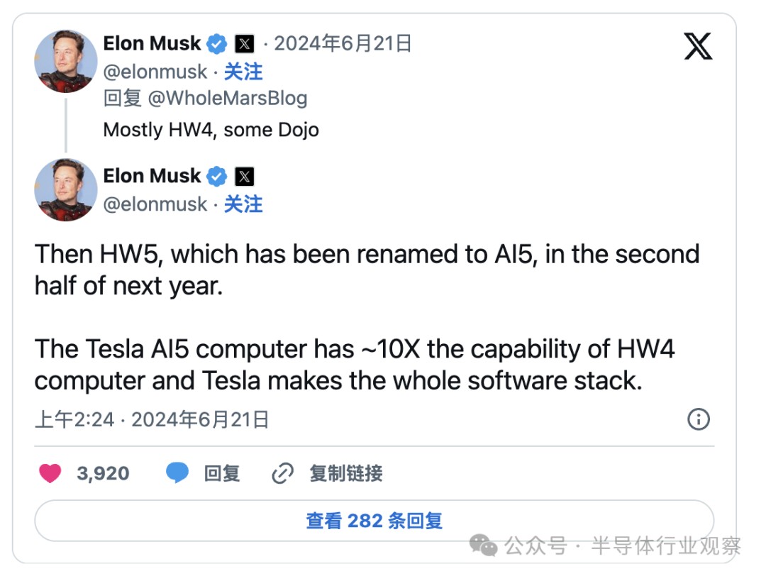 马斯克甚至表示,AI5 的能力大约是 HW4 的十倍: