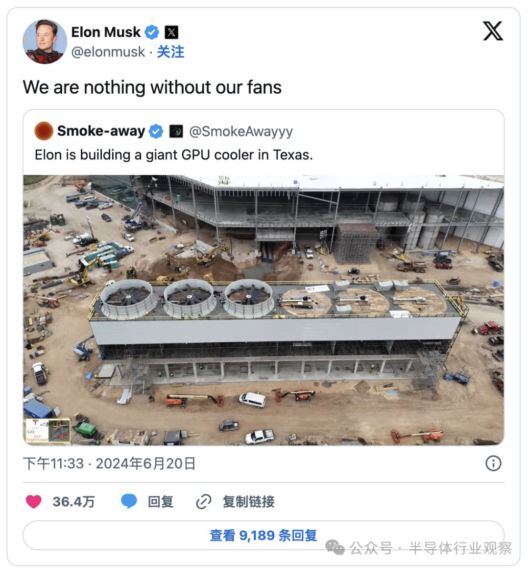 这一切始于德克萨斯州超级工厂的巨型风扇,马斯克证实 “今年该工厂将使用约 130MW 的电力和冷却设备,但未来 18 个月左右将增加到 500MW 以上”。