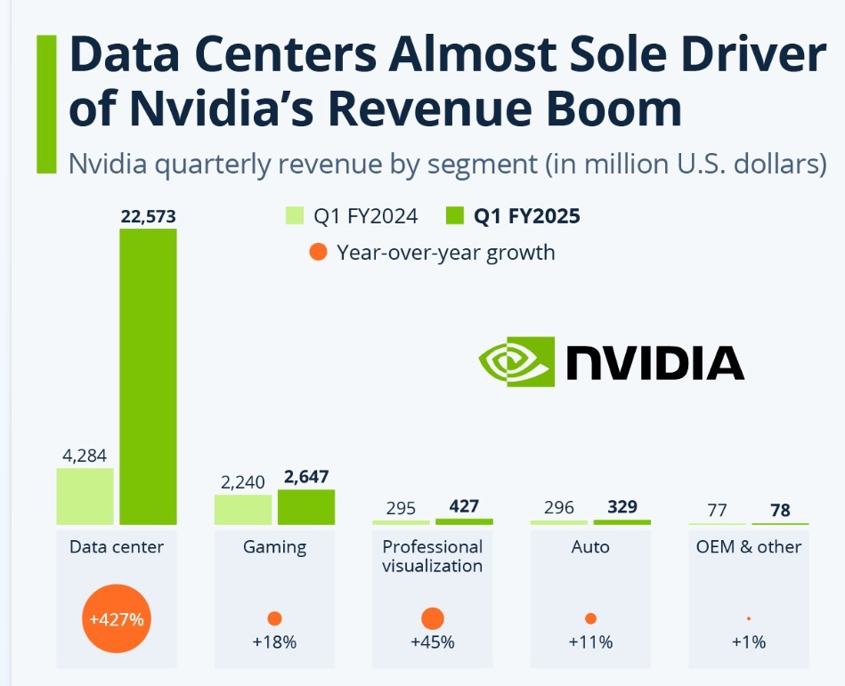 英伟达 2025 财年 Q1 总营收规模同比增长 262% 至 260 亿美元,总营收一举创下历史新高,连续四个季度远超华尔街分析师普遍预期,并且总营收同比增速是英伟达连第三个季度同比增速超过 200%。在 H100/H200 GPU 强劲的需求助力之下,英伟达 Q1 数据中心营收同比增长 427% 至 226 亿美元创历史新高。要知道,英伟达超过的上述这些季度普遍预期,乃华尔街分析师们在英伟达业绩公布之前经过不断上调后得出的营收预期。
