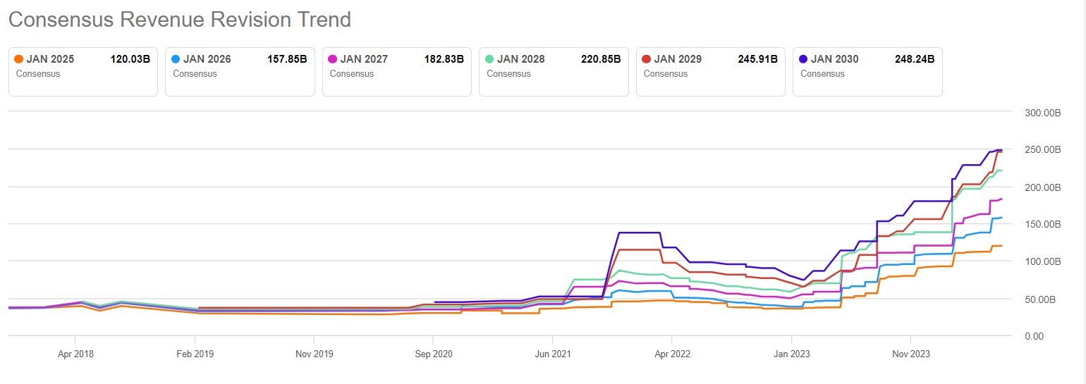 以上这一问题,覆盖英伟达股票的华尔街分析师,甚至英伟达的高管们也不清楚最终的精确答案。英伟达 H100/H200/GB200 等 AI GPU 乃驱动 ChatGPT 以及 Sora 等重磅人工智能应用必不可少的最核心硬件,因此 “AI 卖铲人” 英伟达潜在营收规模太过强劲,华尔街分析师们罕见地完全无法跟上增长步伐,使得他们的预测工作变得愈发困难。