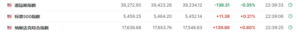 蓝筹股为主的道指早盘走软,曾跌 177 点或 0.45%;高开 12.86 点的标普 500 大盘维持涨势,一度涨近 0.3%;科技股为主的纳指高开 75.34 点,早盘曾涨近 157 点或 0.9%。