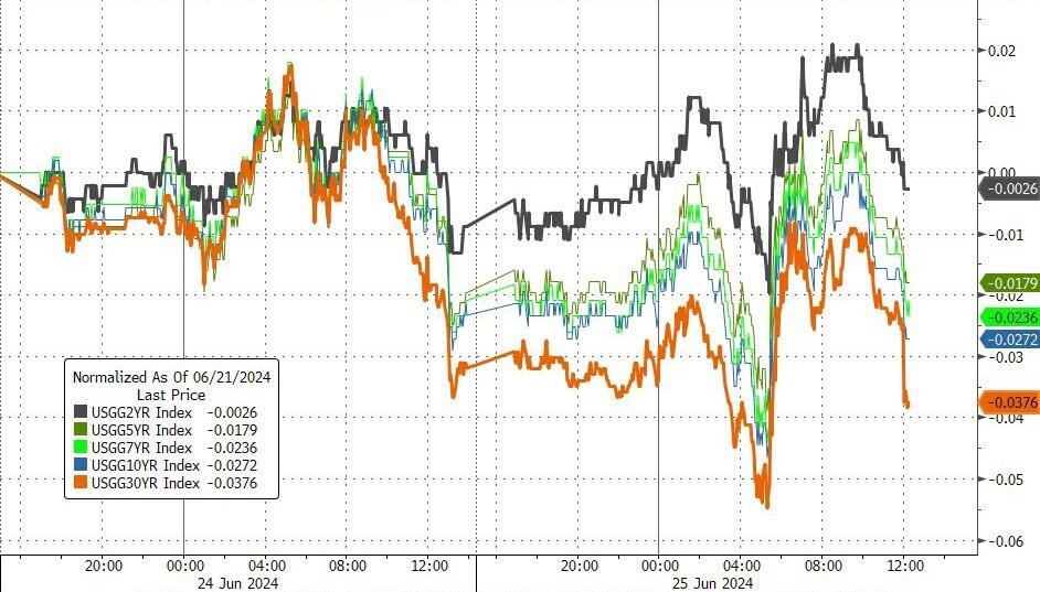 美联储理事鲍曼鹰派发声,若通胀没有持续改善将支持加息,加拿大 5 月 CPI 重新加速,对加拿大央行 7 月降息构成阻碍。美股走势分化,道指收跌近 300 点且六日里首跌,英伟达市值重上 3.10 万亿美元,芯片股指显著反弹 1.8%,财报利好令联邦快递盘后涨 15%,获德国大众投资令 Rivian 盘后涨 46%。中概指数跌 1.3% 至近十周最低,但小鹏汽车转涨 1%,理想汽车跌超 2% 后小幅转涨。诺和诺德欧股与美股齐创新高,空客欧股跌超 12% 后跌超 9%。美债收益率尾盘基本抹去日内的小幅涨幅,美元走高,日元连续多日下逼 160,离岸人民币徘徊七个月低谷,比特币升穿 6.2 万美元。油价跌 1%,美油失守 81 美元,布油下逼 85 美元脱离八周最高。现货黄金失守 2320 美元至一周低位,伦铜十周最低,纽约可可期货再跌 10%。