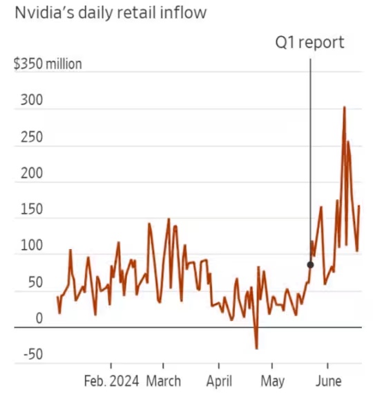 跟踪个人投资者行为的 Vanda Research 的数据显示,实际上,英伟达在整个 2024 年都显示出有强劲的散户买盘,5 月底发布 Q1 财报后,散户资金日流入量出现了显著上升。