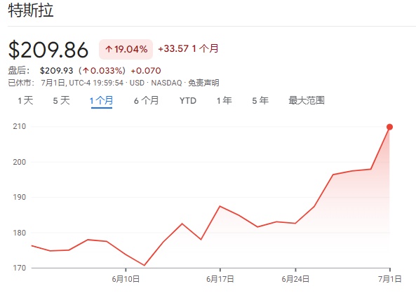 隔夜特斯拉涨逾 6% 至 209.86 美元,市值大涨 2800 亿元,自 1 月份来首次收复 200 日均线。近期特斯拉接连大涨,一个月内涨幅达到 19%。