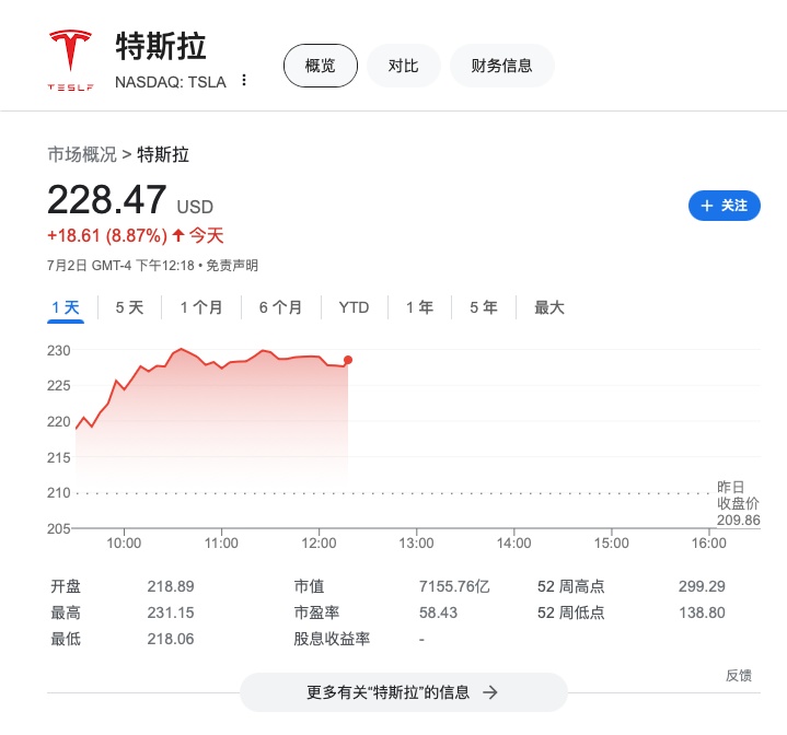 CFRA Research 副总裁兼高级股票分析师加勒特·尼尔森表示,超出预期的交付量 “极大地缓解了对电动汽车需求疲软的担忧。在 6 月中旬的年度会议上,股东重新批准了马斯克 2018 年的薪酬计划后,特斯拉的股价继续乘着积极的势头。”