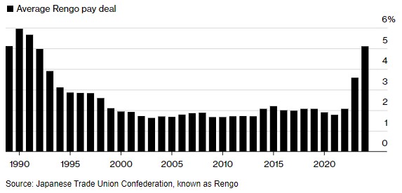 智通财经 APP 获悉,日本年度工资谈判以 30 多年来最大幅度的增长圆满落幕,这一结果为日本央行长期寻求的工资上涨趋势提供了有力证明。据了解,日本最大的工会组织——工会联合会 Rengo 于周三宣布了今年工资谈判的最终数据,其成员工资实现了 5.1% 的增长。虽然这一数字略低于 3 月份公布的初步增幅 5.28%,但依旧创下了自 1991 年以来的最高记录。Rengo 代表着约 700 万名工人,占日本劳动力的 10%。