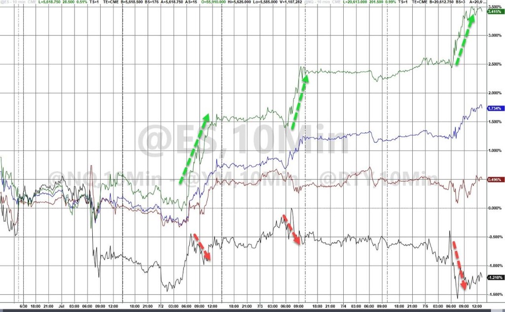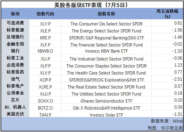 7 月 5 日周五,科技股为主的纳指、标普 500 大盘盘中一路走高,收盘再创历史新高;蓝筹股汇聚的道指虽多次短线转跌,但尾盘上行并收涨于日高;罗素小盘股指数维持跌势,纳指在主要指数中涨幅相对最大,纳科技股居多的纳指 100 涨 1%。