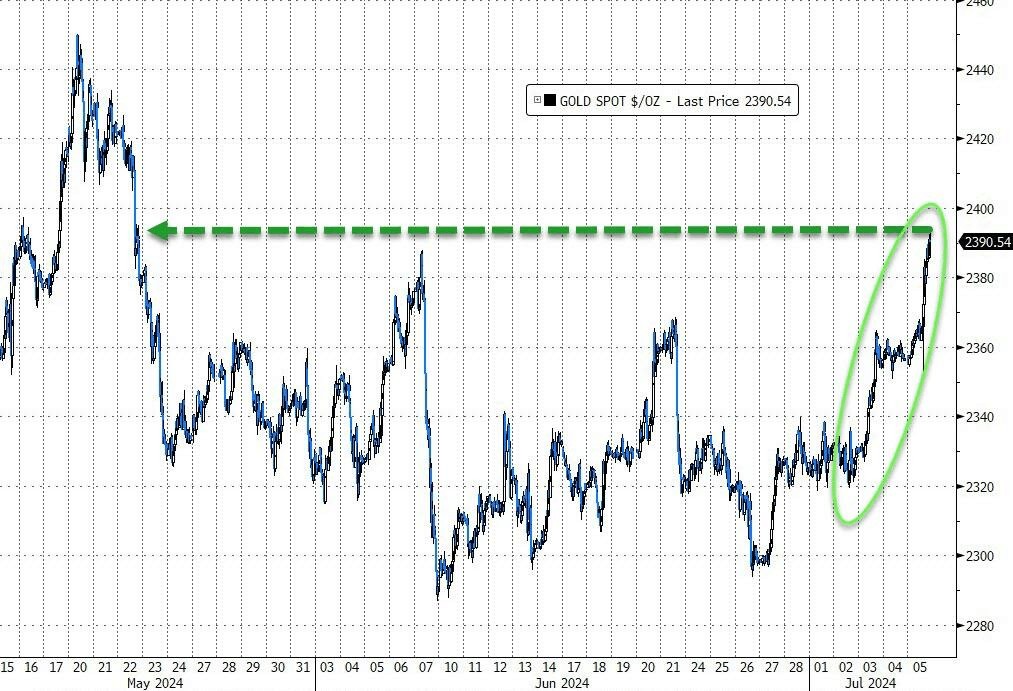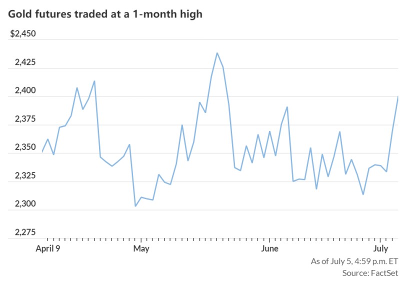 周五收盘,8 月交割的纽交所黄金期货 GCQ24 和 GC00 结算价为每盎司 2397.70 美元,当日上涨 28.30 美元,涨幅 1.2%。黄金收盘价创下 5 月 21 日以来的最高水平。